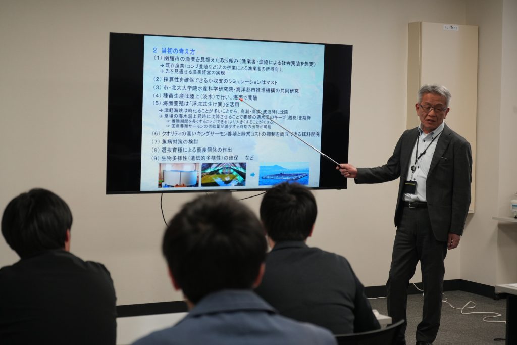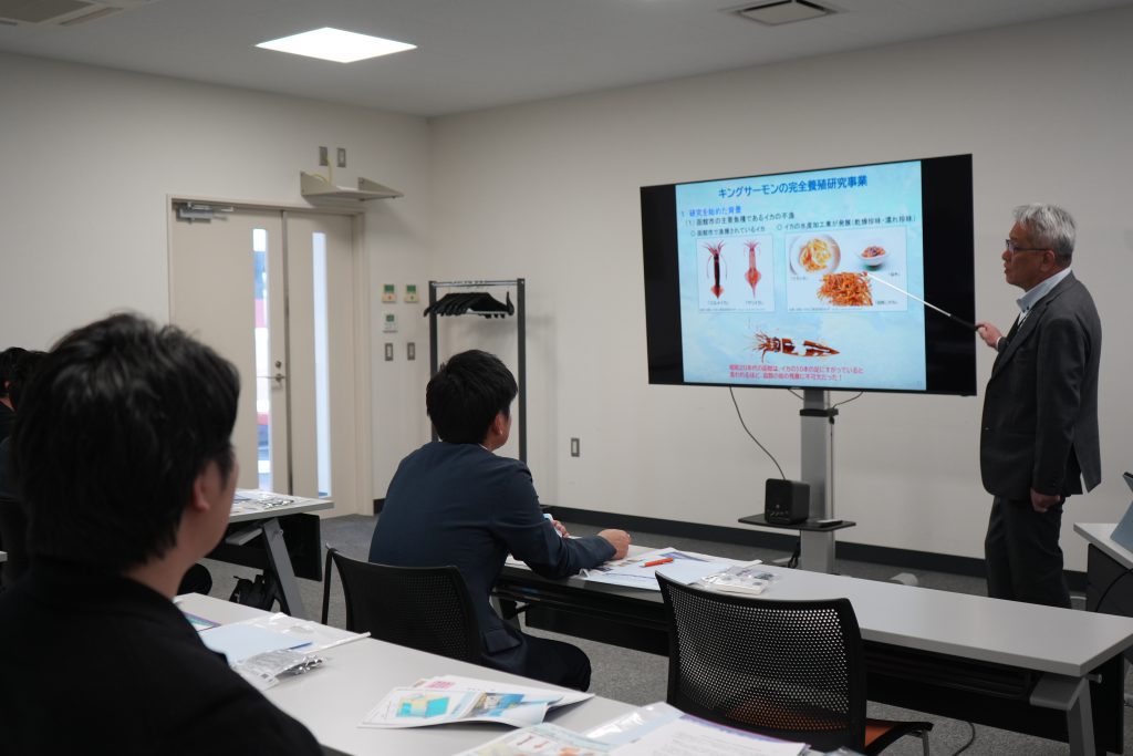 当日は、一般財団法人函館国際水産・海洋都市推進機構の川村事務局長より、「函館国際水産・海洋都市構想」や海洋研究センターの役割、キングサーモン・マコンブ完全養殖やRCN(地域カーボンニュートラル)に取り組む函館マリカルチャープロジェクトについてご説明させていただきました。