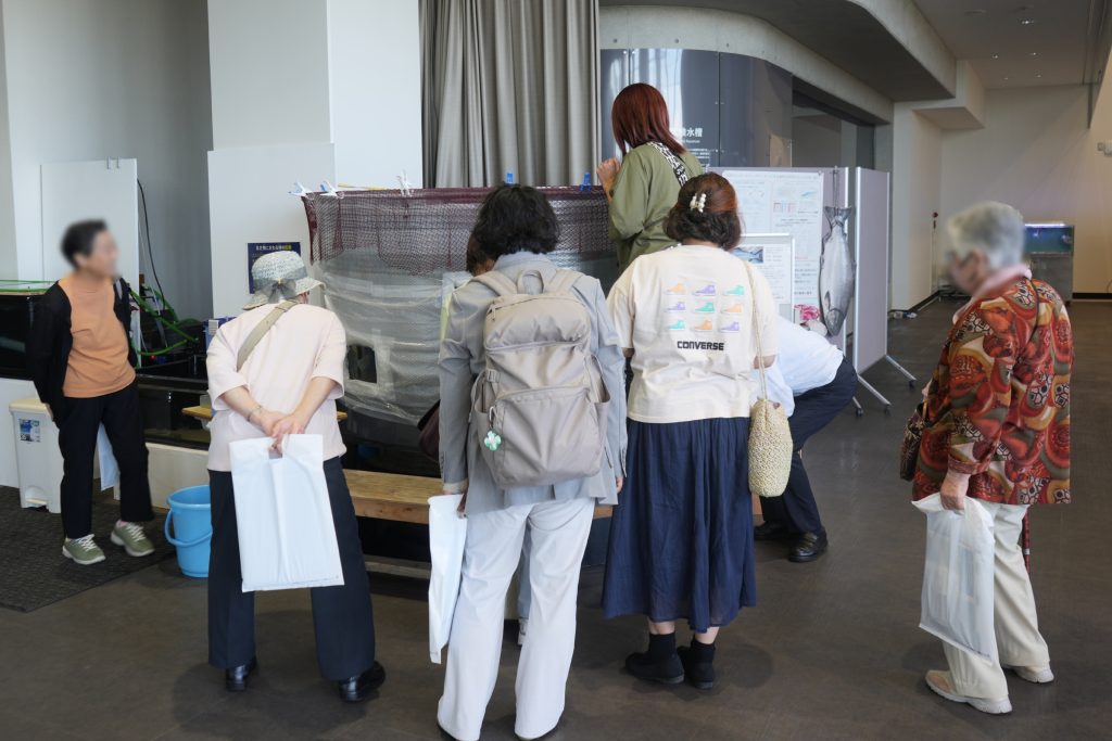 その後の海洋研究センターの見学では、キングサーモン幼魚の展示水槽の観察や餌やり体験、エントランスホールのミニ水族館の見学や実験水槽室のスルメイカ畜養水槽などの観察のほか、4階展望ロビーからの景色をご覧いただきました。