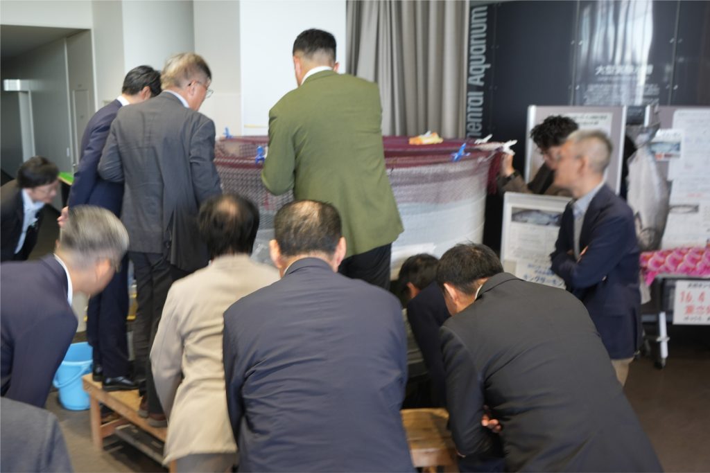海洋研究センターの視察では、エントランスホールのキングサーモン展示水槽での餌やりや観察、2023年4月に採捕された天然キングサーモンの16.4kg重さ体験をしていただき ました。