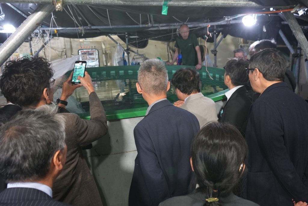 また、実験水槽室では、プロジェクトの餌料開発研究の現場やスルメイカの畜養水槽などを視察していただき、最後は、海洋研究センター4階の展望ロビーにて函館湾と函館港 などの景色をご覧いただきました。