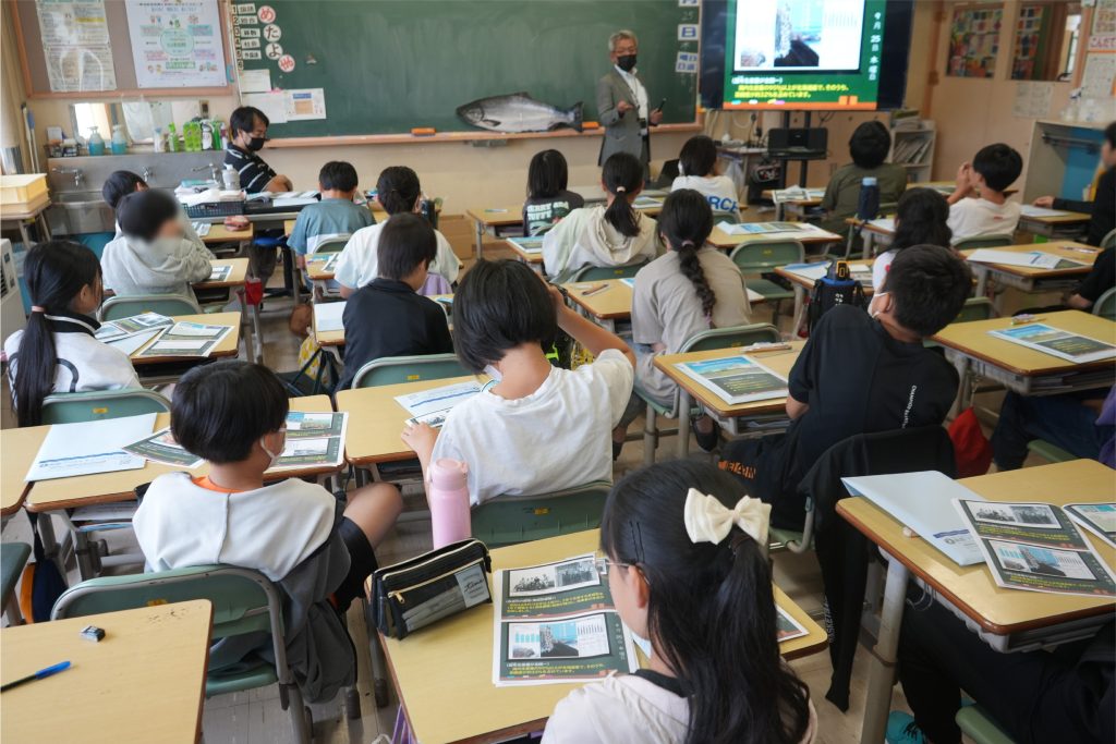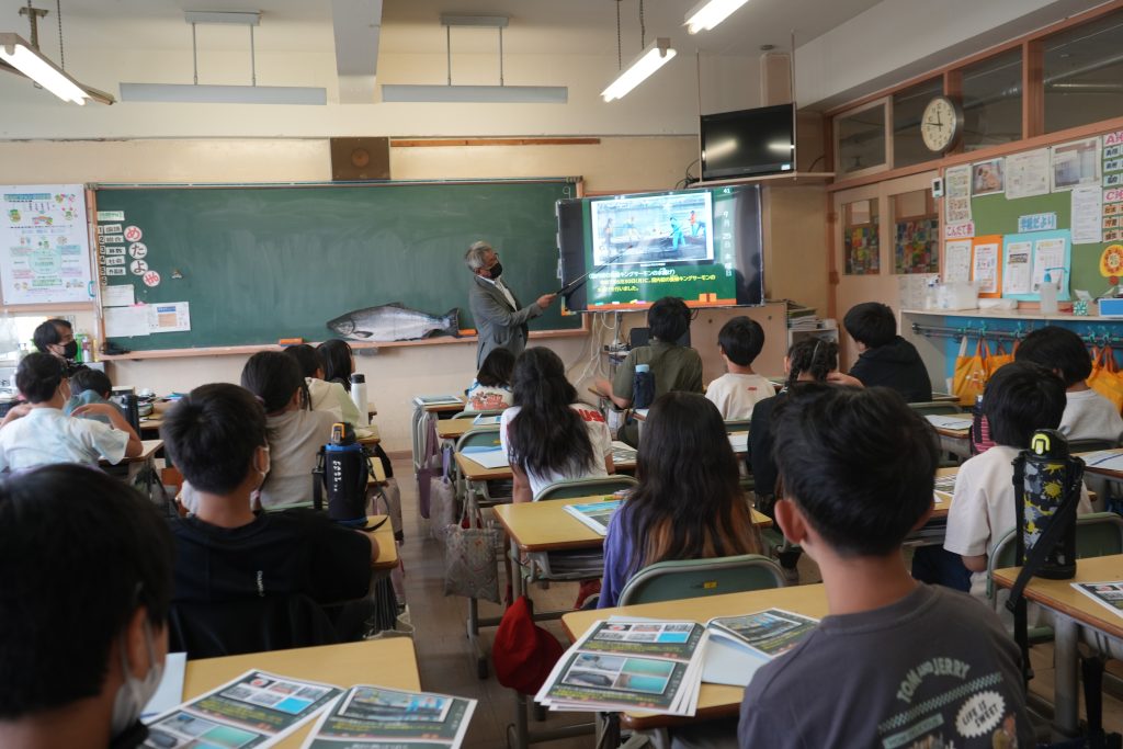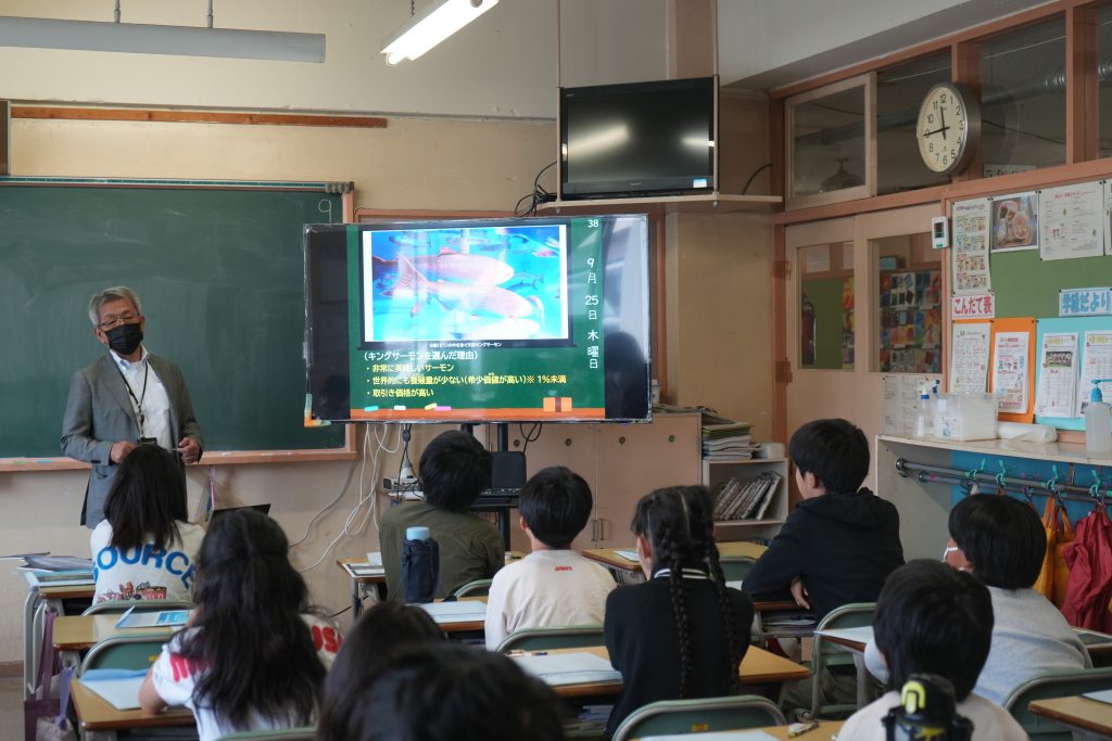 9月25日(木)に、函館市立東山小学校5年2組の「総合的学習の時間」の授業において、 (一財)函館国際水産・海洋都市推進機構の川村事務局長から「函館の漁業」「函館の漁業生産の変化」「函館を支えてきた漁業」「キングサーモンの養殖」について児童の皆さんに説明しました。