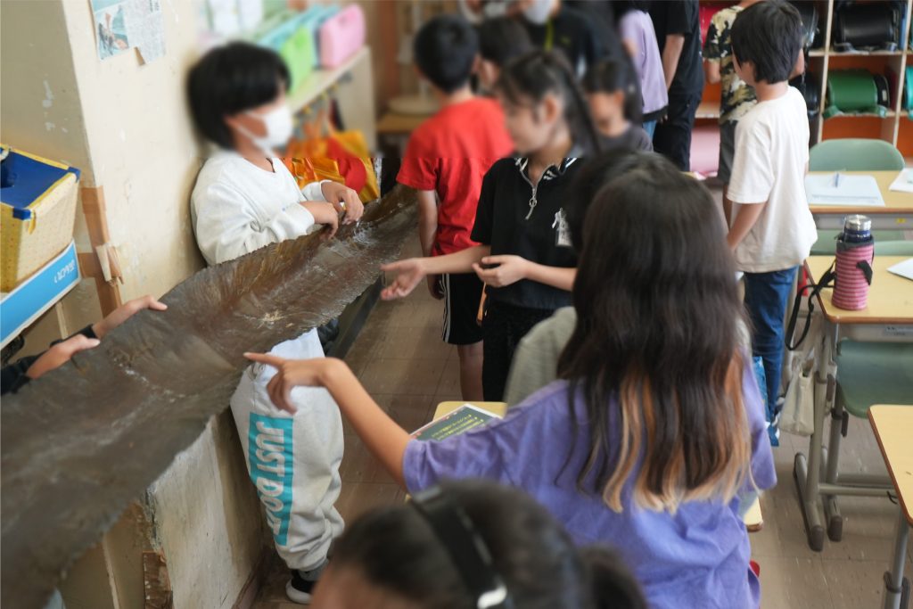 授業の終わりには、児童の皆さんに手伝っていただいて、教室内に長さ約6mの加工前の「函館真昆布」を伸ばした状態にして、児童の皆さんに触れていただきました。