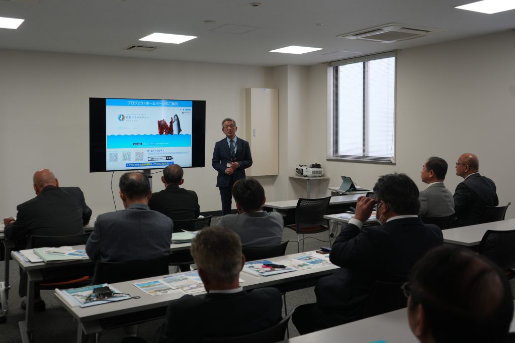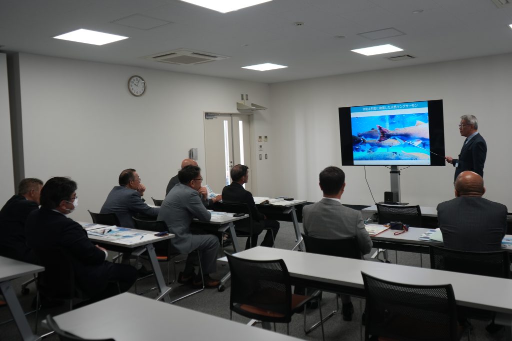 初めに厚岸町議会の大野議長よりご挨拶をいただき、その後、(一財)函館国際水産・海洋都市推進機構の川村事務局長から、函館国際水産・海洋都市構想と海洋研究センターの概要、本プロジェクトと同機構が担っているキングサーモン完全養殖研究の概要を説明しました。