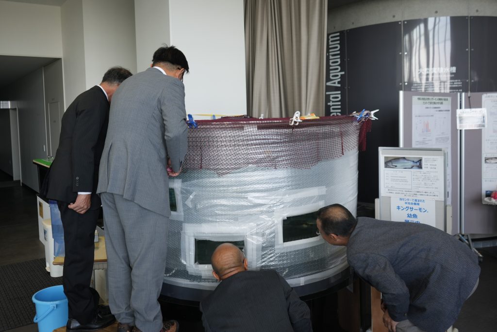 海洋研究センターの視察では、キングサーモンの稚魚と幼魚、実験水槽室のスルメイカ畜養水槽などを見ていただき、4階展望ロビーにもご案内しました。