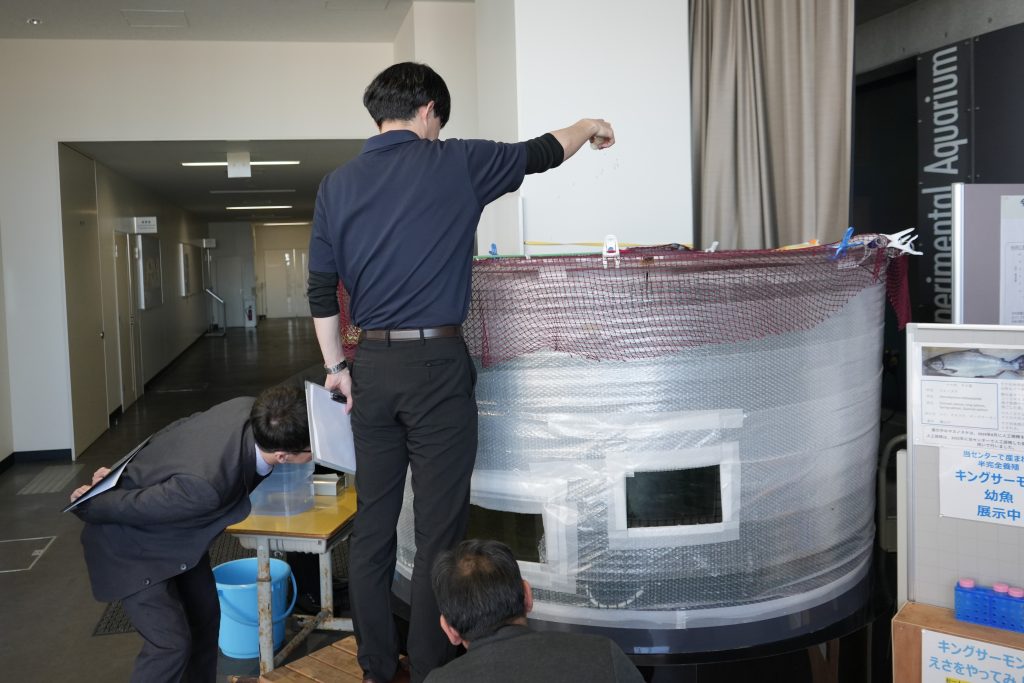 海洋研究センターの視察では、キングサーモンの稚魚と幼魚の水槽、実験水槽室や共同実験室などを見ていただき、4階展望ロビーにもご案内しました。