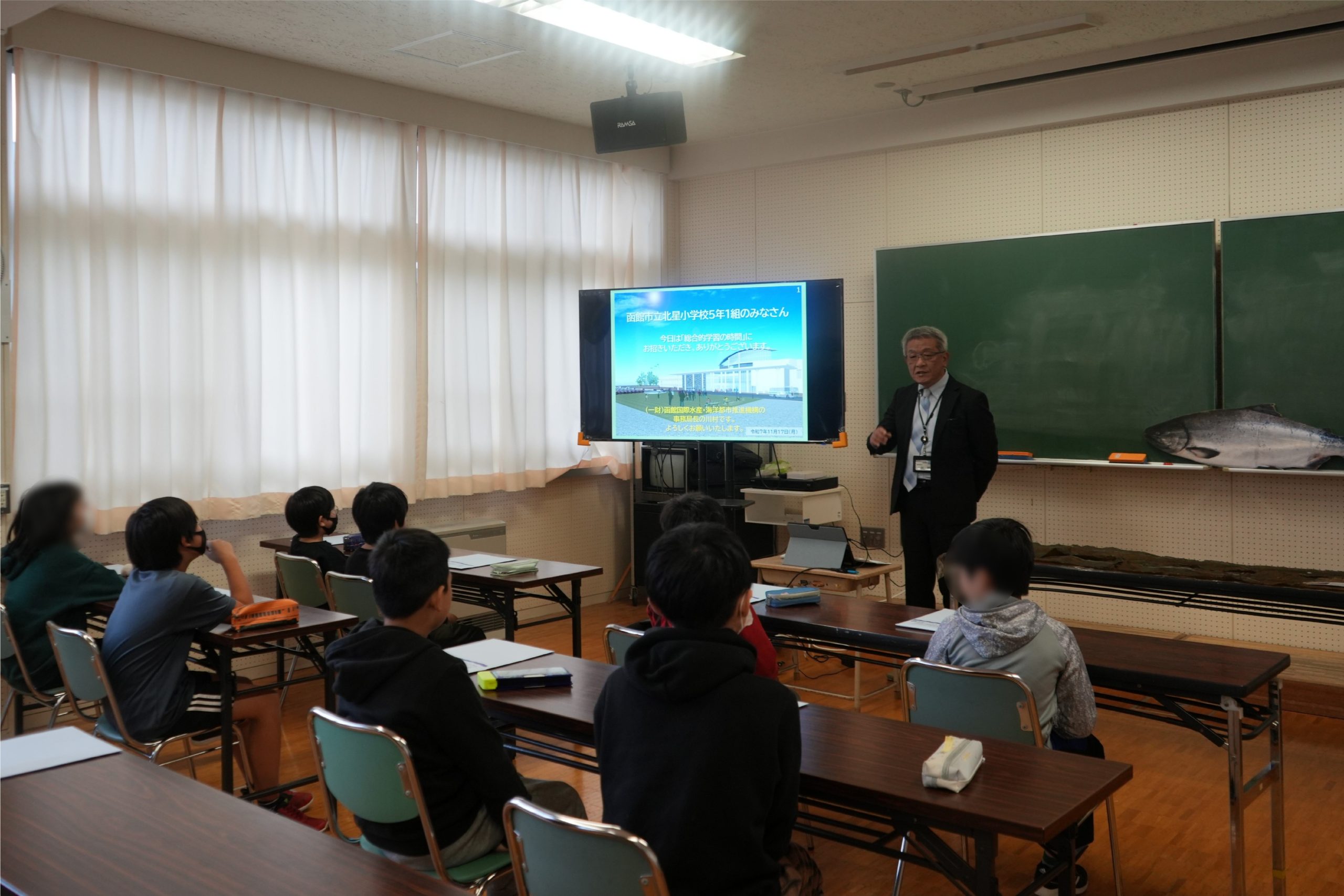 函館市立北星小学校の5年生と6年生の皆さんにキングサーモン養殖等を説明し…